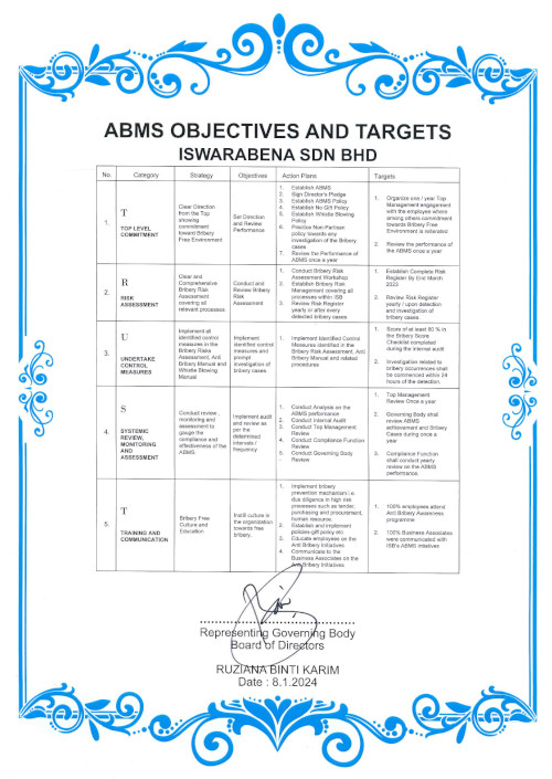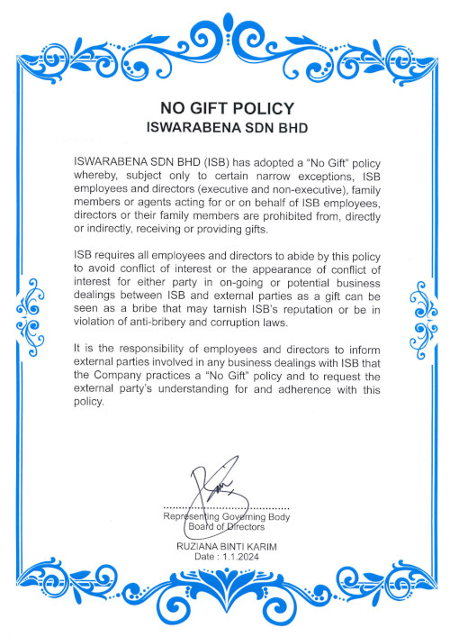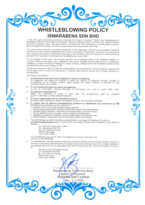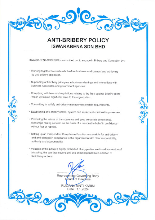 Iswarabena Sdn Bhd has implemented a policy to maintain the highest standards of ethical, moral, and legal conduct, supporting good management practices and sound corporate governance. This commitment ensures the company's long-term success, reputation, and stakeholder trust.