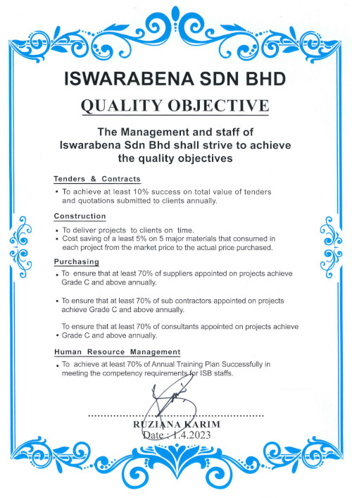 ISWARABENA SDN. BHD. is committed in delivering quality construction services to its clients, minimizing adverse impact on the environment and protecting the safety and health of its clients, employees, workers, the general public and other stakeholders. This is achieved by undertaking the following: